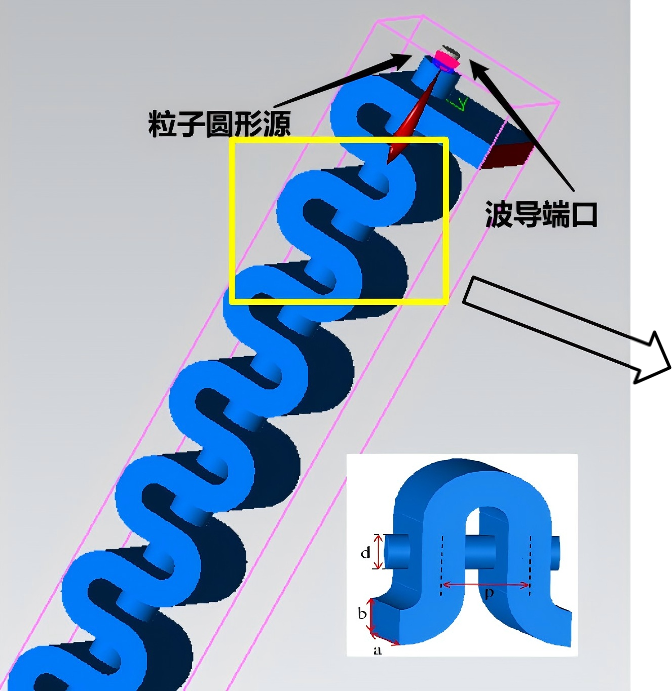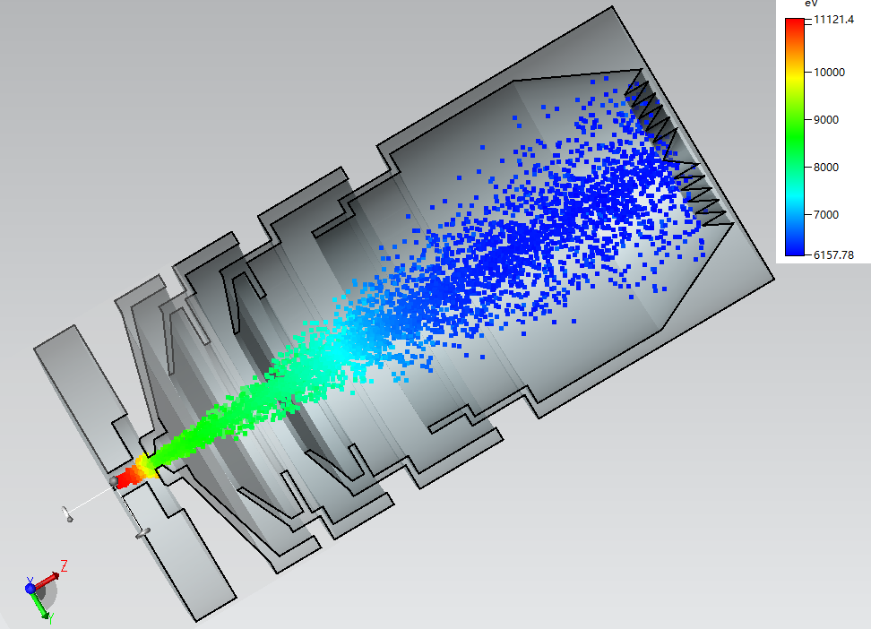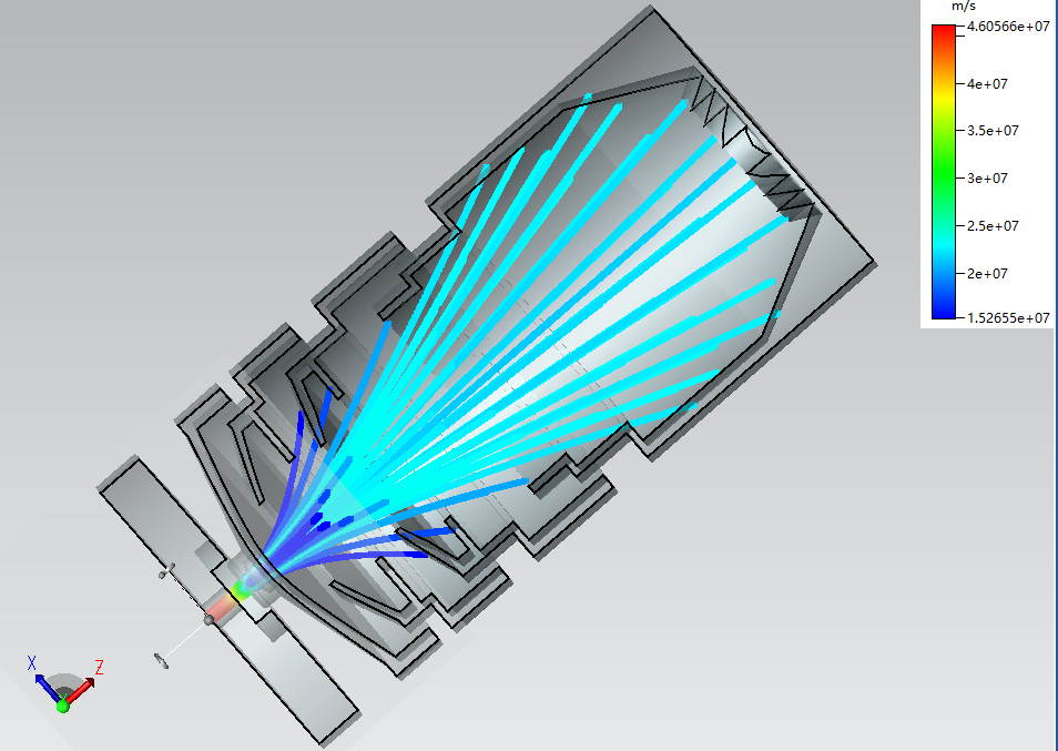 煌沣基于全局非均匀网格与曲面共形网格技术,研发了精确求解多尺度、曲形边界等复杂模型下粒子与电磁场的互作用问题的粒子模拟仿真能力,能够分析折叠波导行波管、扩展互作用速调管等多种新型真空电子器件中的注波互作用问题。其具备的GPU加速计算能力,有效减少了粒子模拟算法在仿真此类器件时的计算效率低下的问题,可以使得设计师快速得到器件的输出功率和电子效率等关键参数信息,对器件进行优化。